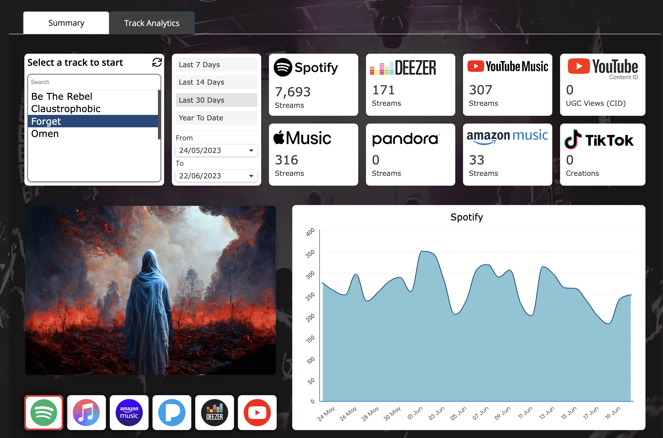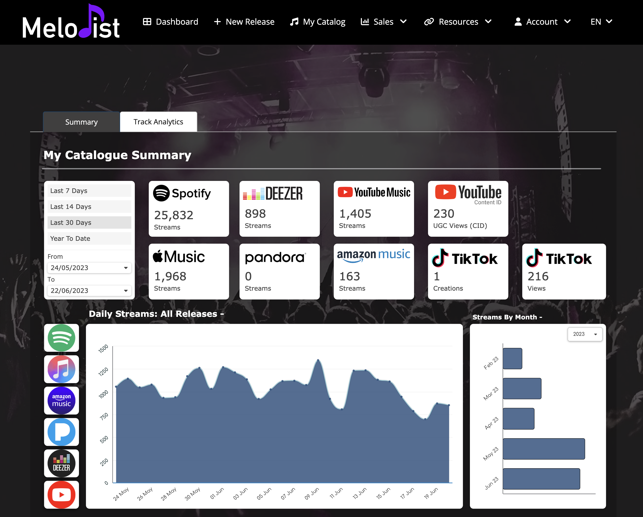Many music distributors only give you Spotify and Apple Music stats, but we also include Deezer, Pandora, YouTube Music, YouTube Content ID, Amazon Music and TikTok stats.