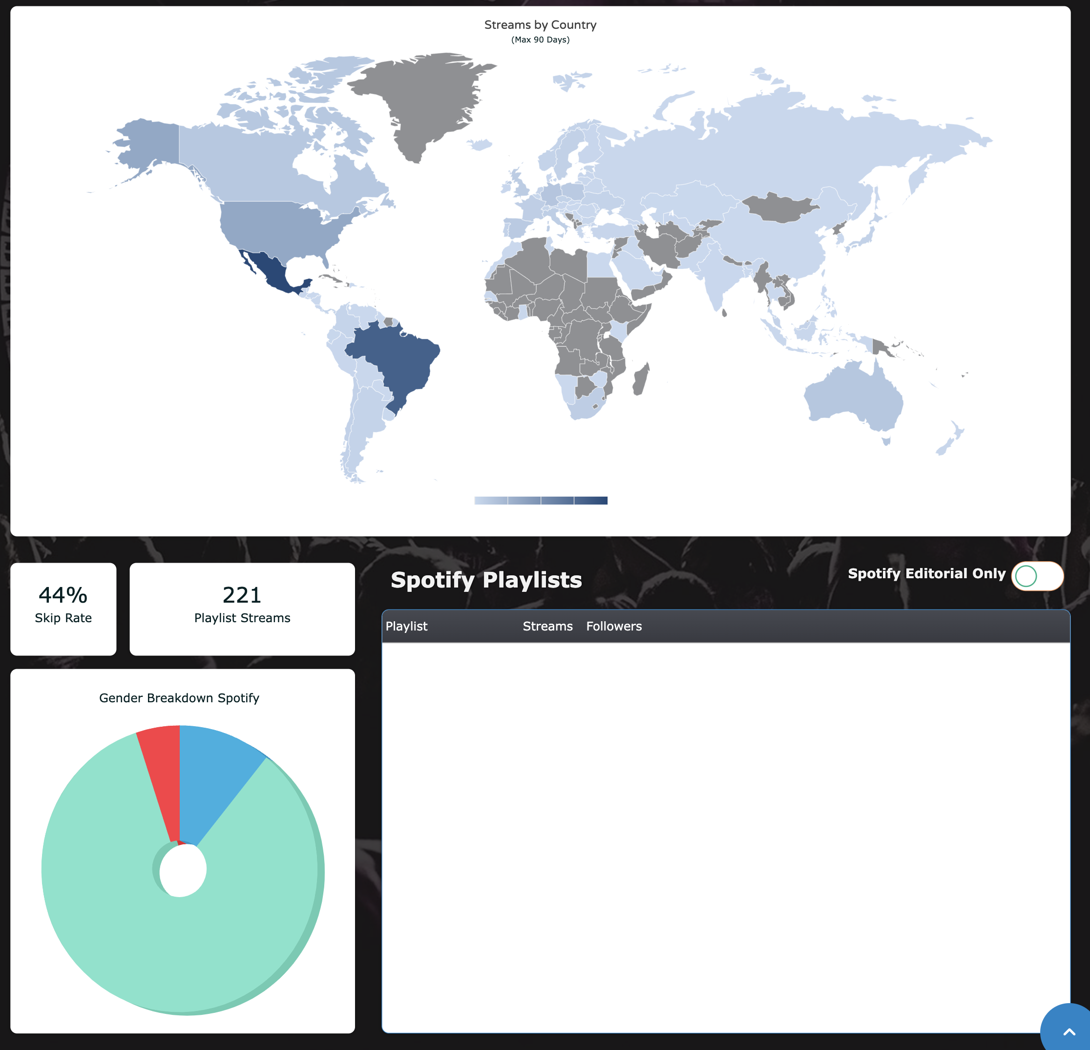 You'll also get a country breakdown for the song, and if you choose to look at Spotify stats you'll see Skip Rate percentage and Playlist Streams.